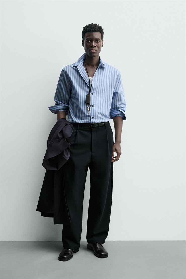 Relaxed fit shirt made of cotton blend fabric. Lapel collar and long sleeves with buttoned cuffs. Front button closure.