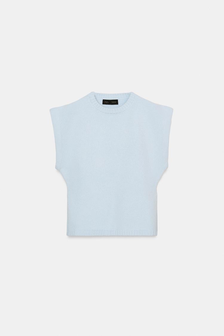 Plain knit vest with a round neck and wide armholes with defined shoulders. Hem with side vents.