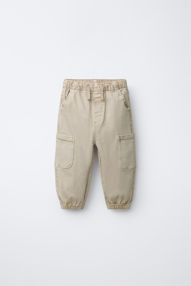 Jogger pants with elastic waistband and adjustable front drawstrings. Elastic hem. Front pockets with label appliqué and patch pockets at sides and back.