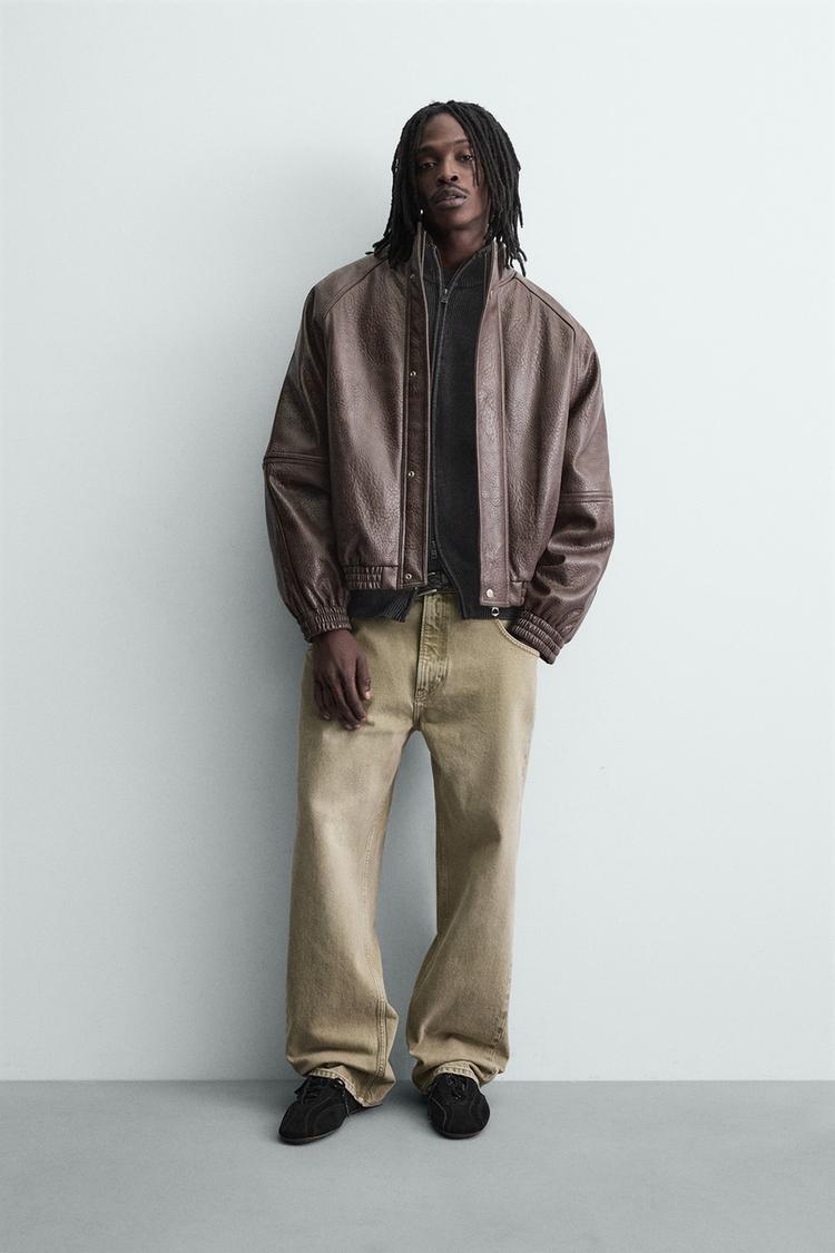 Regular fit jacket made of faux leather fabric. Lapel collar and long sleeves. Hip pockets and interior pocket detail. Front zip closure hidden by a flap with metal fireman clasps.