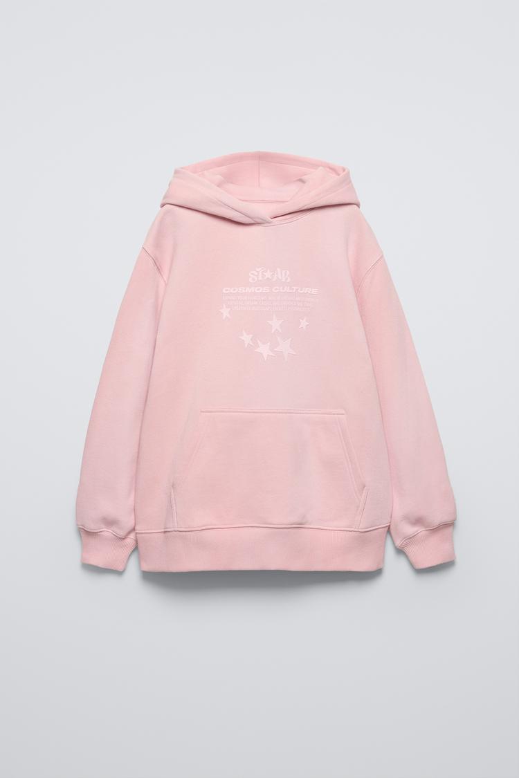 Hoodie jacket with high collar, long sleeves, and elastic cuffs. Front zipper closure hidden by snap button flap. Front pockets with piping detail. Elastic hem.