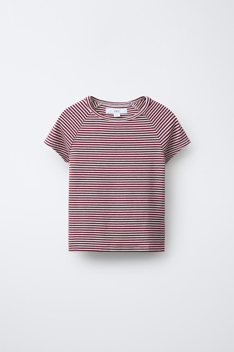 Round neck T-shirt with raglan short sleeves. Fabric with 49% modal. Striped print.