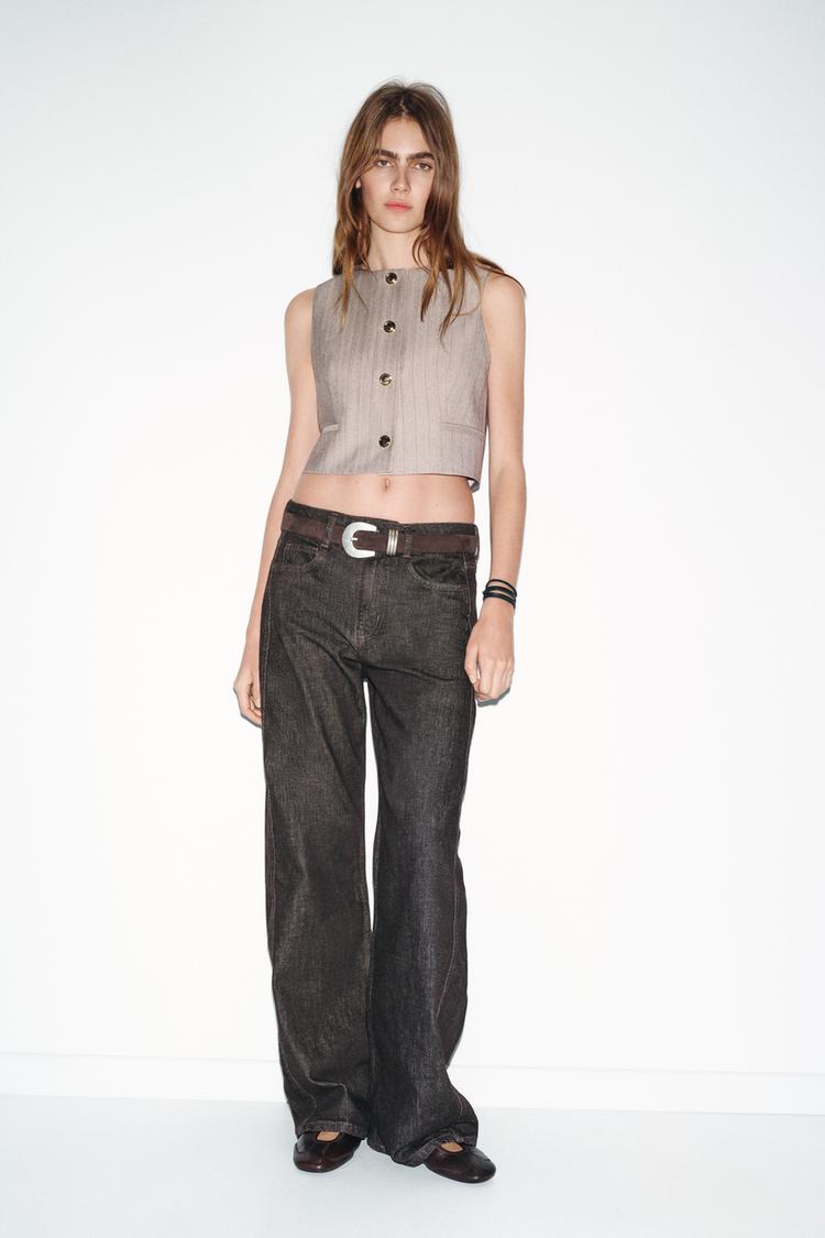 Short vest with a round neck and sleeveless design. Features false front welt pockets. Fastens at the front with gold buttons.