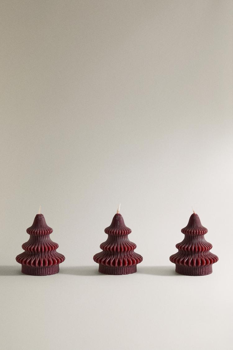 Scented candles in the shape of Christmas trees, made of vegetable wax.