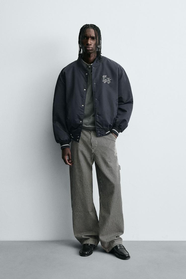 Varsity jacket made of technical fabric with a lightly padded interior. Elastic ribbed collar and long sleeves. Welt pockets at the hip and interior pocket detail. Appliqué patches and contrasting combined embroidery on the front and back. Ribbed trim. Front snap-button closure.