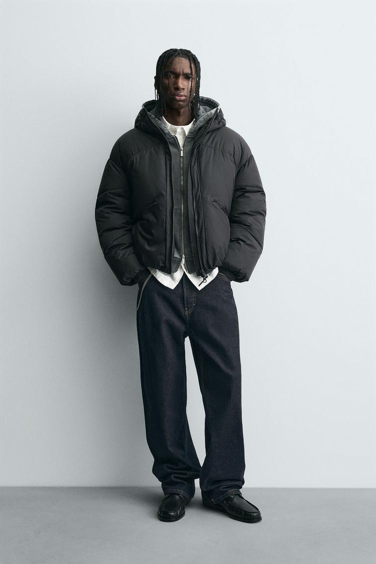 Relaxed fit padded jacket made of technical fabric. High collar with adjustable elastic hoodie. Long sleeves. Zip pockets at hip. Interior pocket detail. Adjustable interior straps with snap buttons. Elastic trim. Front zip closure.
