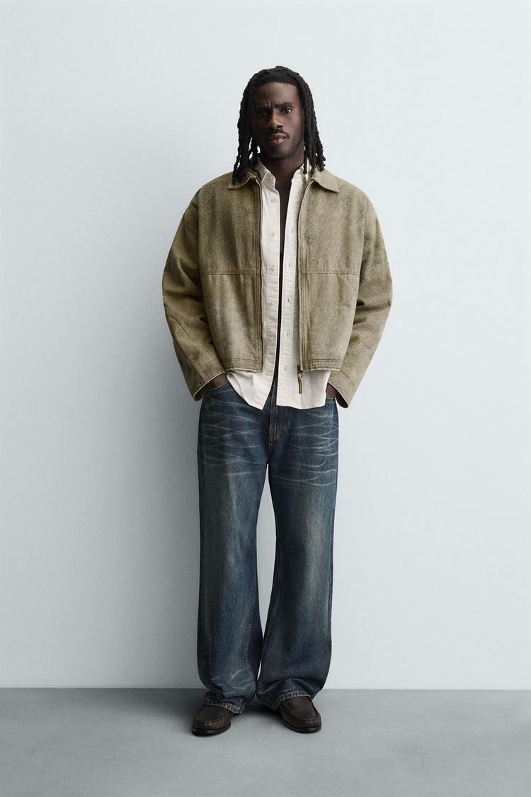 Boxy fit jacket made of cotton fabric with quilted interior. Lapel collar and long sleeves with buttoned cuffs. Patch pockets at hip and interior pocket detail. Washed effect. Front zip closure.