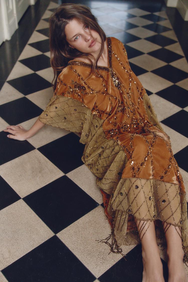 Midi combination dress in velvet and tulle fabric. V-neckline and short sleeves with a wavy finish. Embroidered and metallic thread details. Contrasting bead and sequin appliqué. Fringed hem.