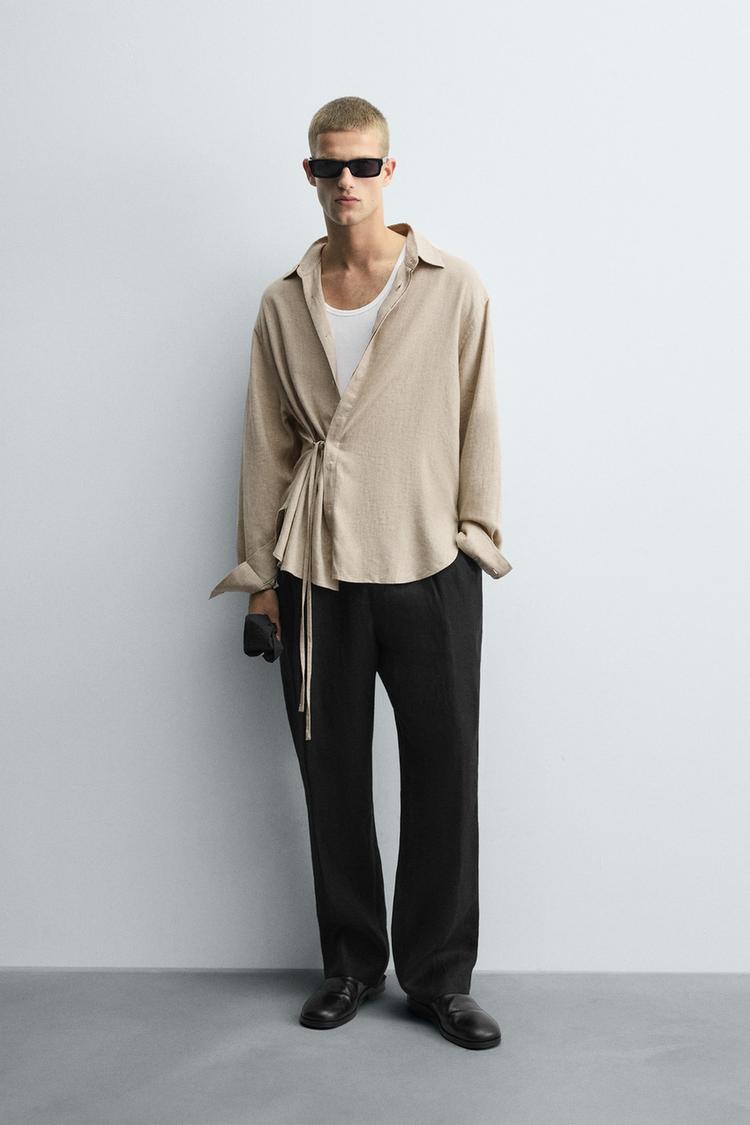Relaxed fit shirt made of fluid fabric with a linen and viscose blend. Lapel collar and long sleeves with buttoned cuffs. Adjustable front with tie. Front button closure hidden by a placket.