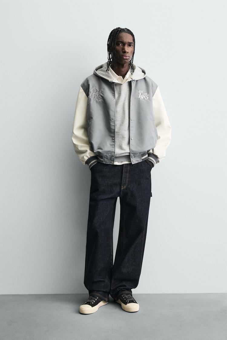 Varsity jacket made of technical fabric combined with a faux leather effect. Ribbed elastic collar and long sleeves. Welt pockets at the hip and an interior pocket detail. Contrasting combined embroidery on the front and back. Ribbed trim. Front snap button closure.