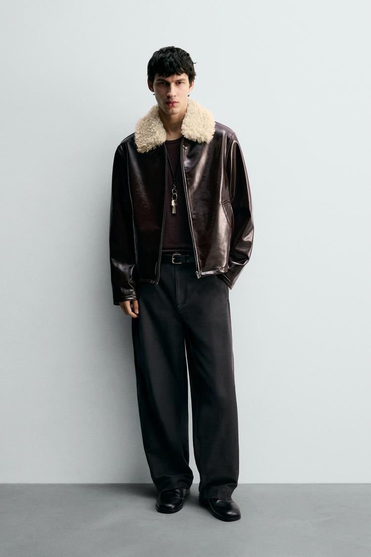 Regular fit jacket made of faux leather fabric with a vinyl finish. Lapel collar with contrasting faux shearling fabric. Long sleeves. Welt pockets at the hip and interior pocket. Front zip closure.
