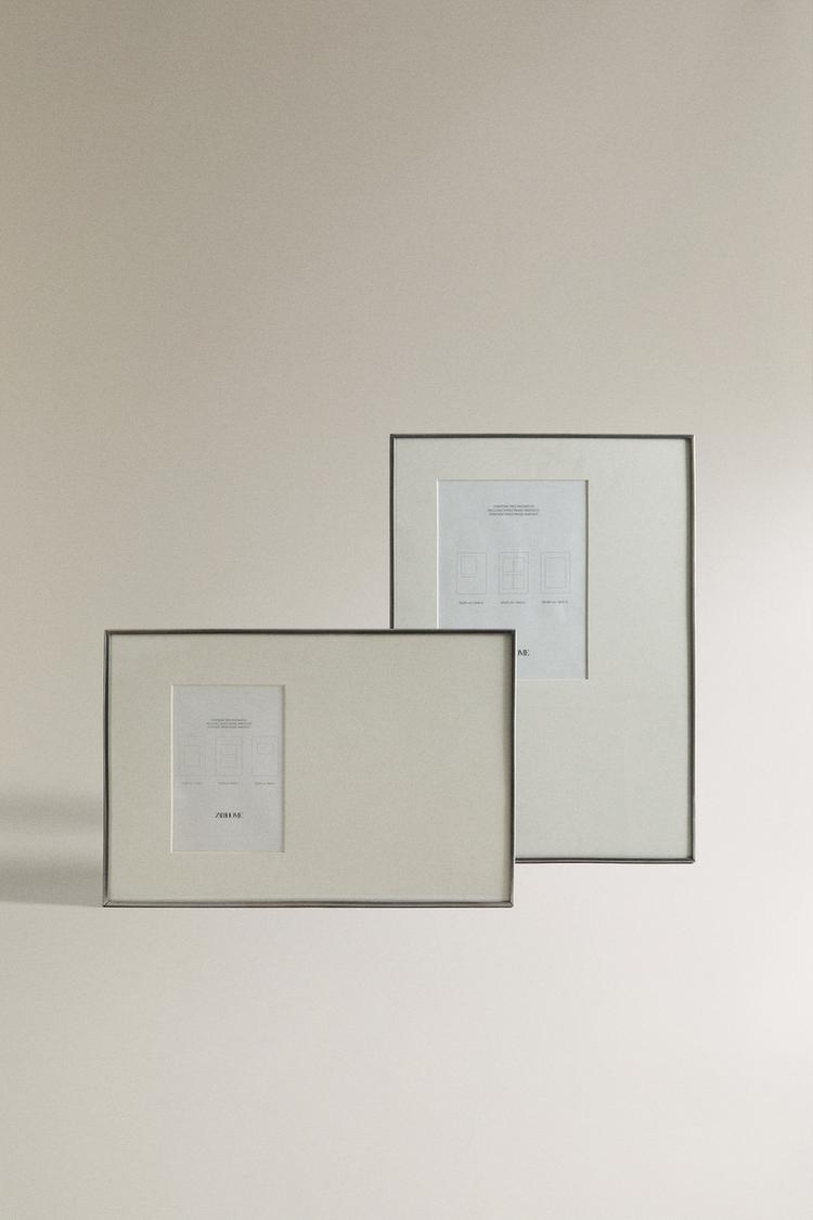Photo frame with a silver metallic border available in two sizes. It can be placed vertically or horizontally and hung on the wall with the attachments at the back. Each frame size contains three interchangeable mats of different sizes for different photographs.