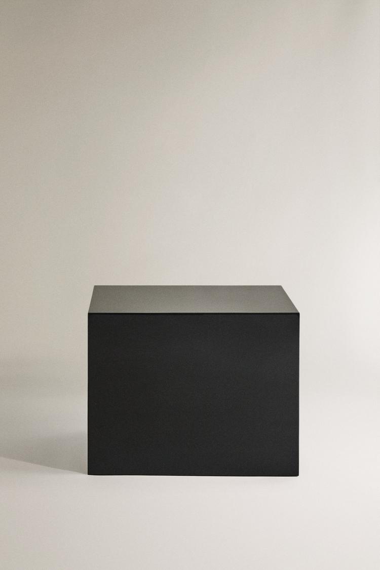 Side table crafted from wood with a black lacquered finish. Features a cubic volume with smooth faces and defined edges. The surface is smooth with a uniform color coating applied in multiple layers of lacquer.