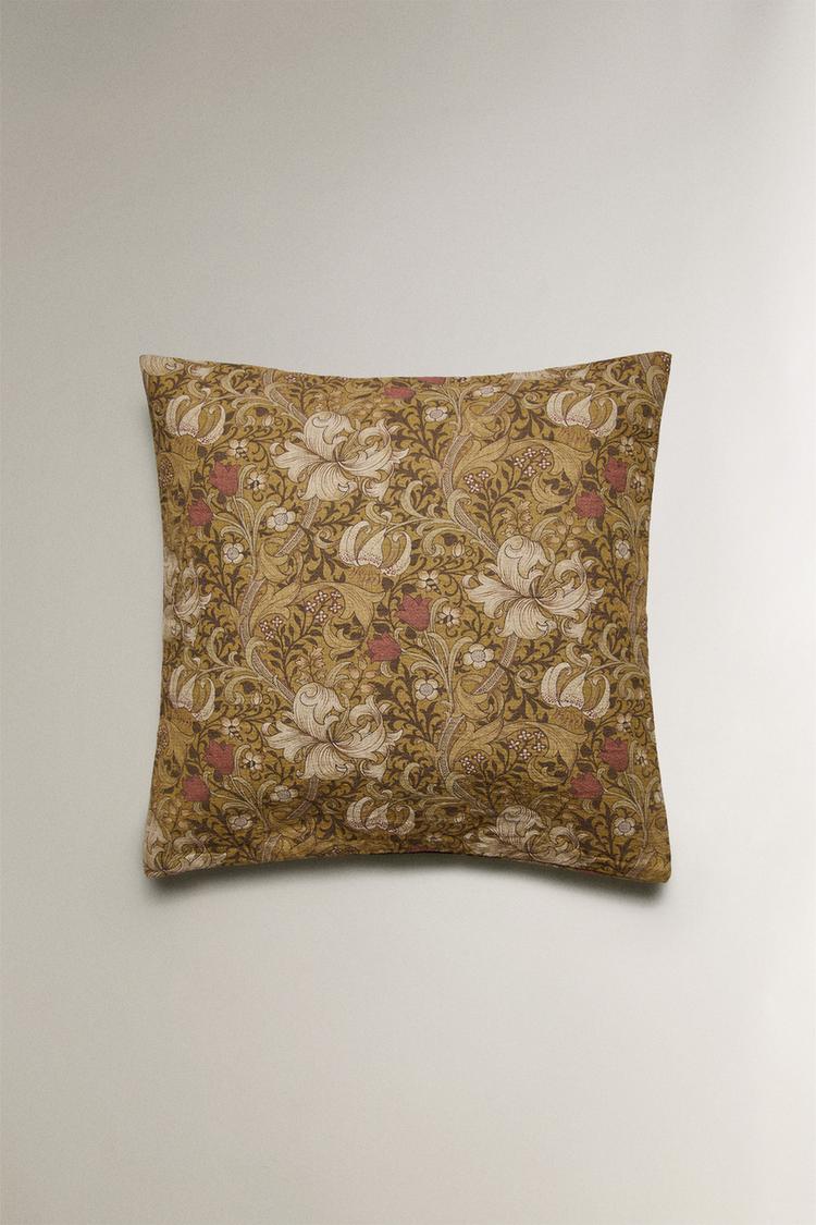Throw pillow cover made from a cotton and linen blend, in yellow with a floral print.