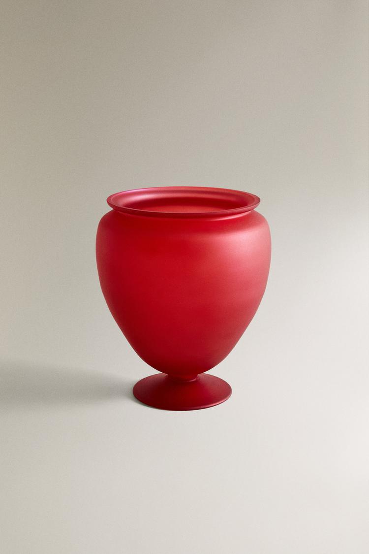 Red iridescent mouth-blown glass vase with a matte finish. It features a cup-shaped body elevated on an integrated base and a gently rounded wide mouth. The surface displays a shifting optical effect depending on the light.