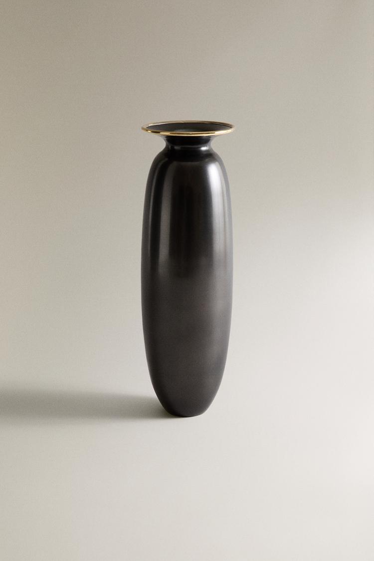 Vase made of blackened brass. Elongated body with a wide mouth and polished top edge. Surface with an aged finish and slight light reflection.