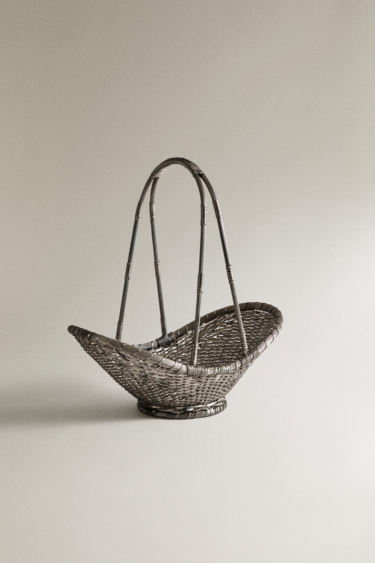 Basket made of woven brass. Features an elongated structure and high, slender handles. The weave exhibits slight variations inherent to the interlacing process.
