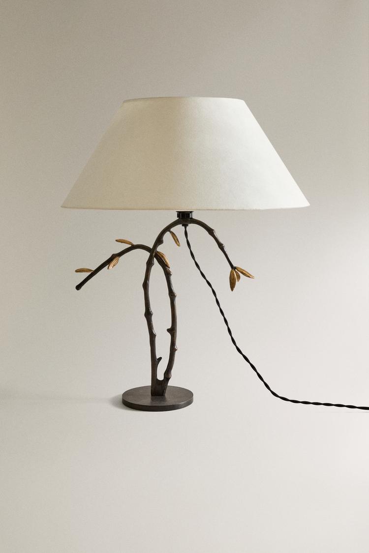 Table lamp with a blackened brass base, featuring superimposed leaf-shaped volumes and a matte black finish. Paper lampshade. Integrated LED lighting. 2 m cable.