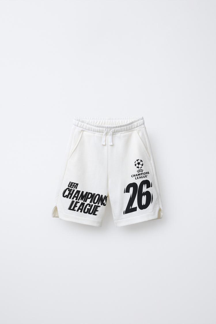 Shorts with an elastic waistband and adjustable front drawstrings. Front pockets and back patch pockets with a label appliqué. Embossed UEFA CHAMPIONS LEAGUE ® print on the front. 100% cotton fabric. Manufactured under licence by INDITEX, S.A. Made in Morocco. The word(s) UEFA, CHAMPIONS LEAGUE, and all other UEFA Champions League marks, names, logos, mascots and trophies are the property, registered trade marks, designs and/or copyright of UEFA. All rights reserved.