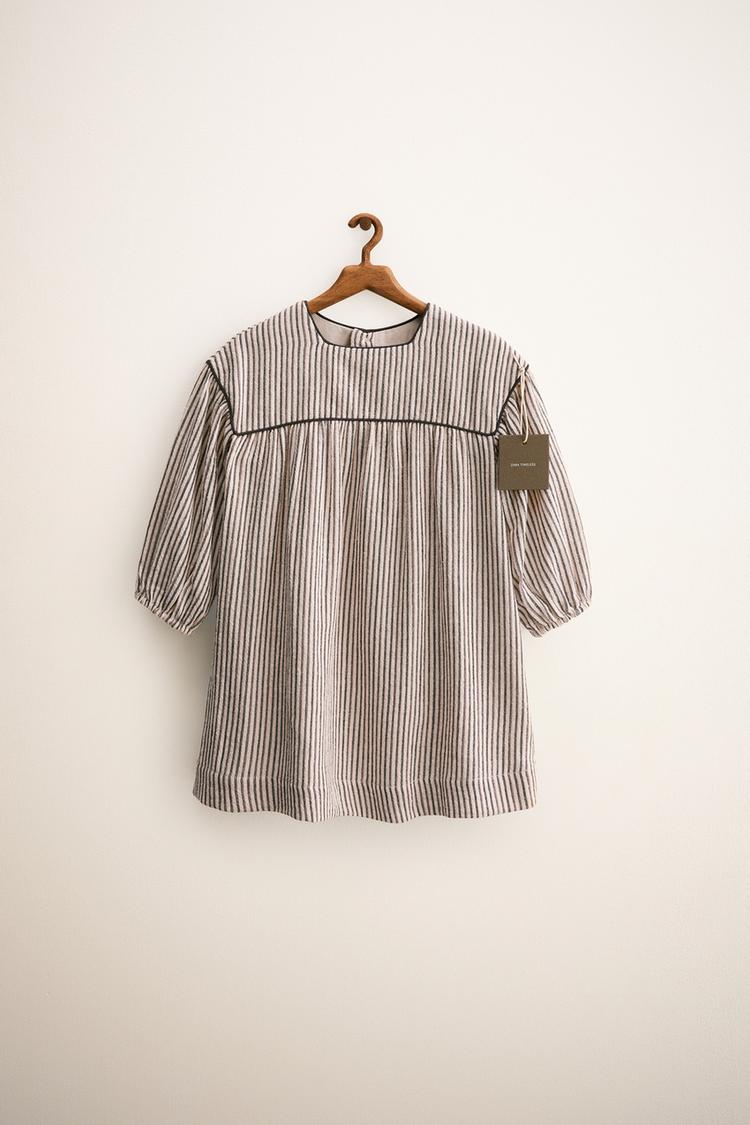 Dress with a wide pattern made of cotton. Back button closure. It features contrasting colored piping.