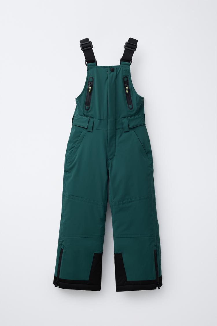 Overalls with a straight collar and adjustable elastic straps. Front heat-sealed zip closure hidden by a flap with a snap button. Adjustable adhesive straps at the waist and belt loops. Chest, front, and back pockets with heat-sealed zip closure. Zip openings on the leg with mesh fabric for greater ventilation. Hem finished with a heat-sealed zipper and elastic inner cuff to tuck inside footwear and prevent snow and cold from entering. Rubberized logo detail on the back. Interior lining detail.