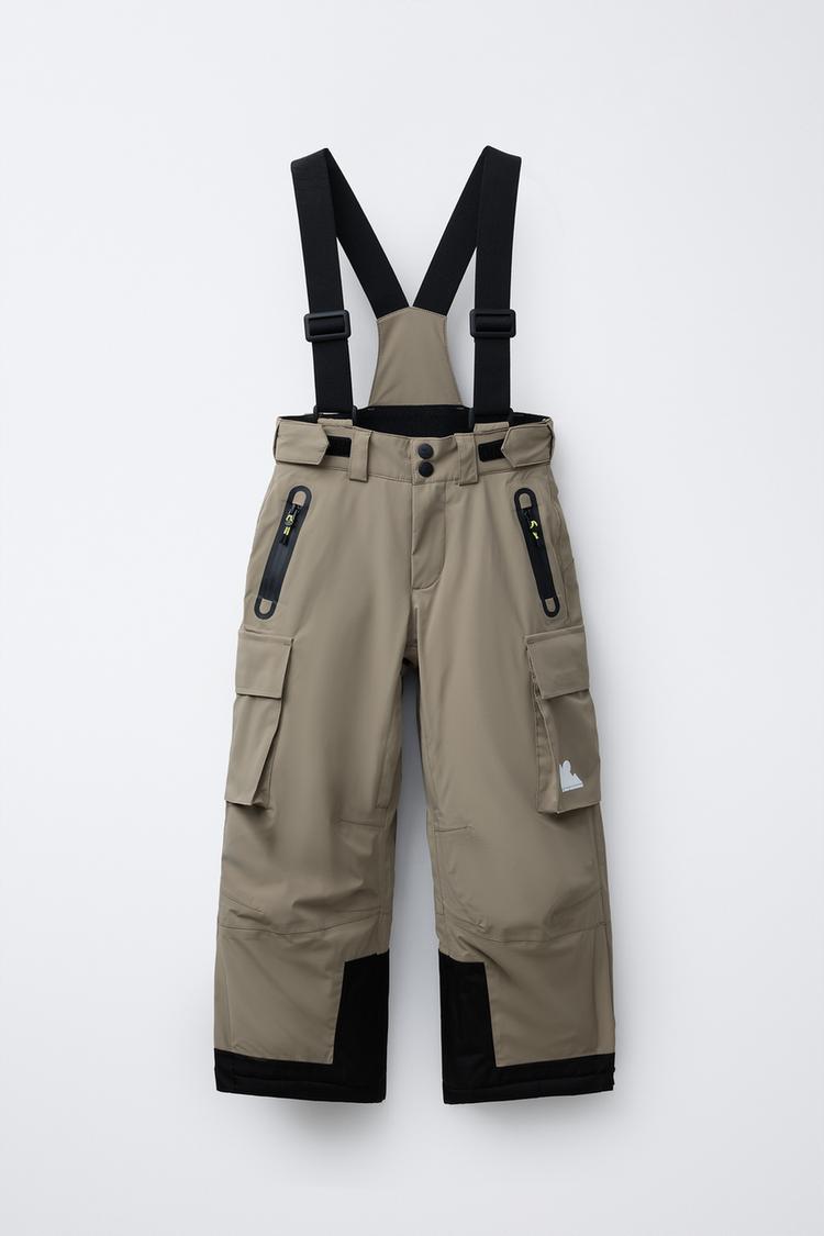 Pants with front snap button closure, adjustable elastic straps, and adjustable adhesive on the sides, belt loops appliqué. Front pockets with heat-sealed zip closure and patch pockets with flap on the side with adhesive closure. Leg openings with zip and mesh fabric for greater ventilation. Hem finished with heat-sealed zip and elastic inner cuff to insert into footwear and prevent snow and cold from entering. Rubberized logo detail on pocket.