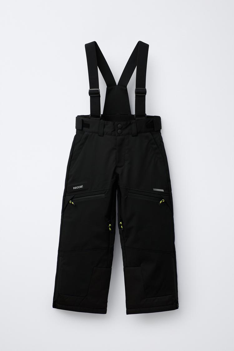 Pants with front snap button closure, adjustable elastic straps, and adjustable adhesive at the sides, with belt loops. Hidden front pockets with heat-sealed zip closure and polar fleece lining, heat-sealed zip pockets at the leg, and a back welt detail. Zip openings at the leg with mesh fabric for greater ventilation. Hem finished with heat-sealed zipper and elastic inner cuff to fit inside footwear and prevent snow and cold from entering. Rubberized logo detail on the back and reflective strips on the pockets.