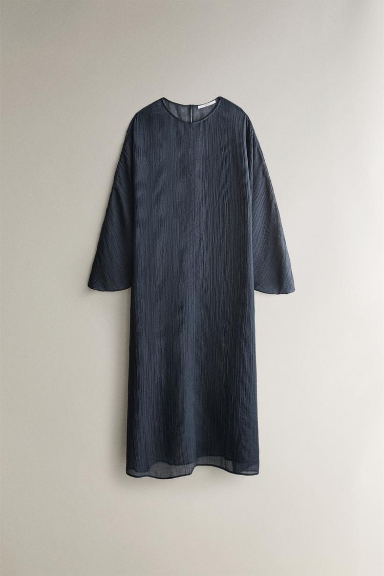 Long, semi-sheer dress crafted from lightweight, fluid fabric, featuring a round neckline and a wide, ethereal design with loose sleeves that add movement.