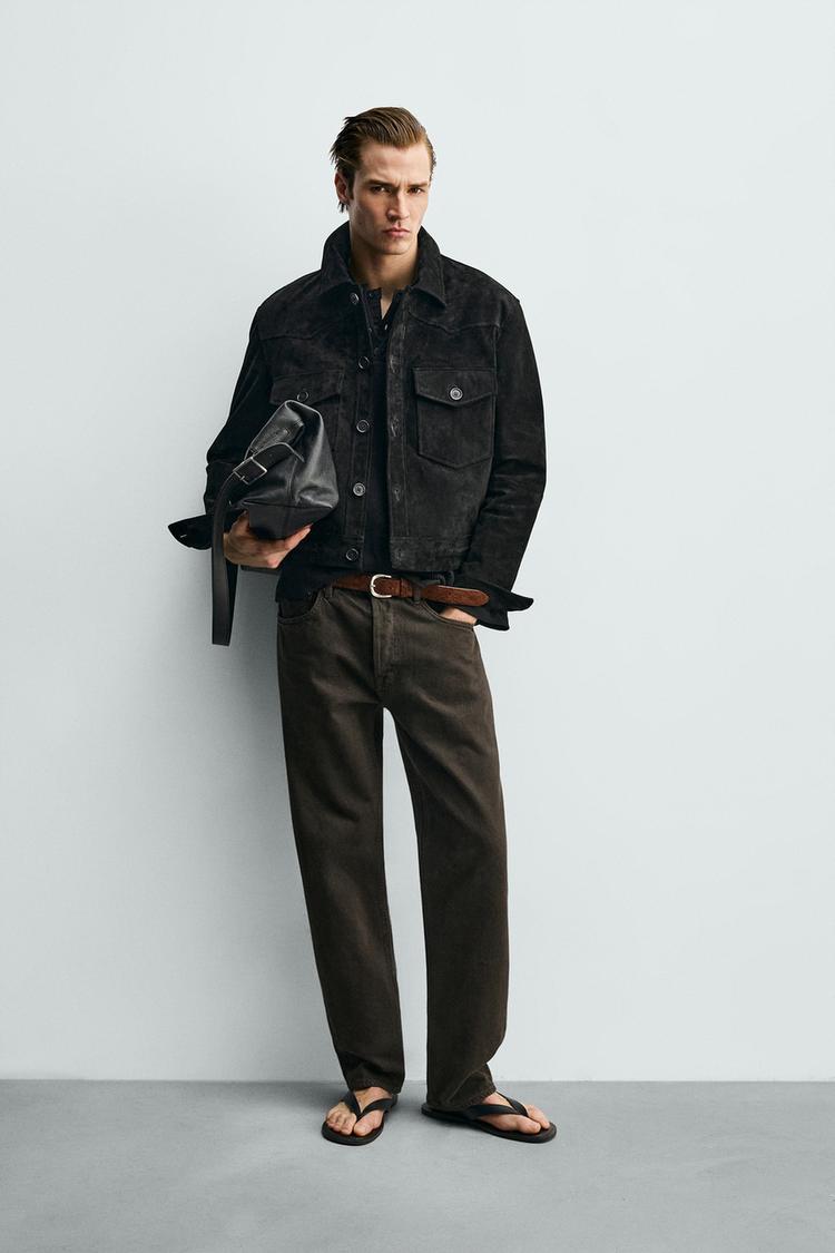 Cropped fit jacket made of leather with a suede finish. Lapel collar and long sleeves with buttoned cuffs. Patch pockets with flaps at chest. Braided trim at hem. Front button closure.