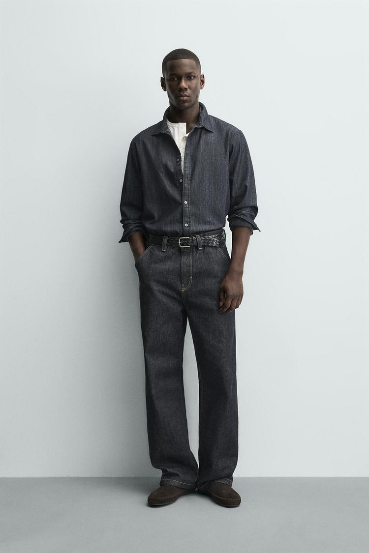 Loose and wide fit throughout the leg. Mid-rise. Stiff fabric.